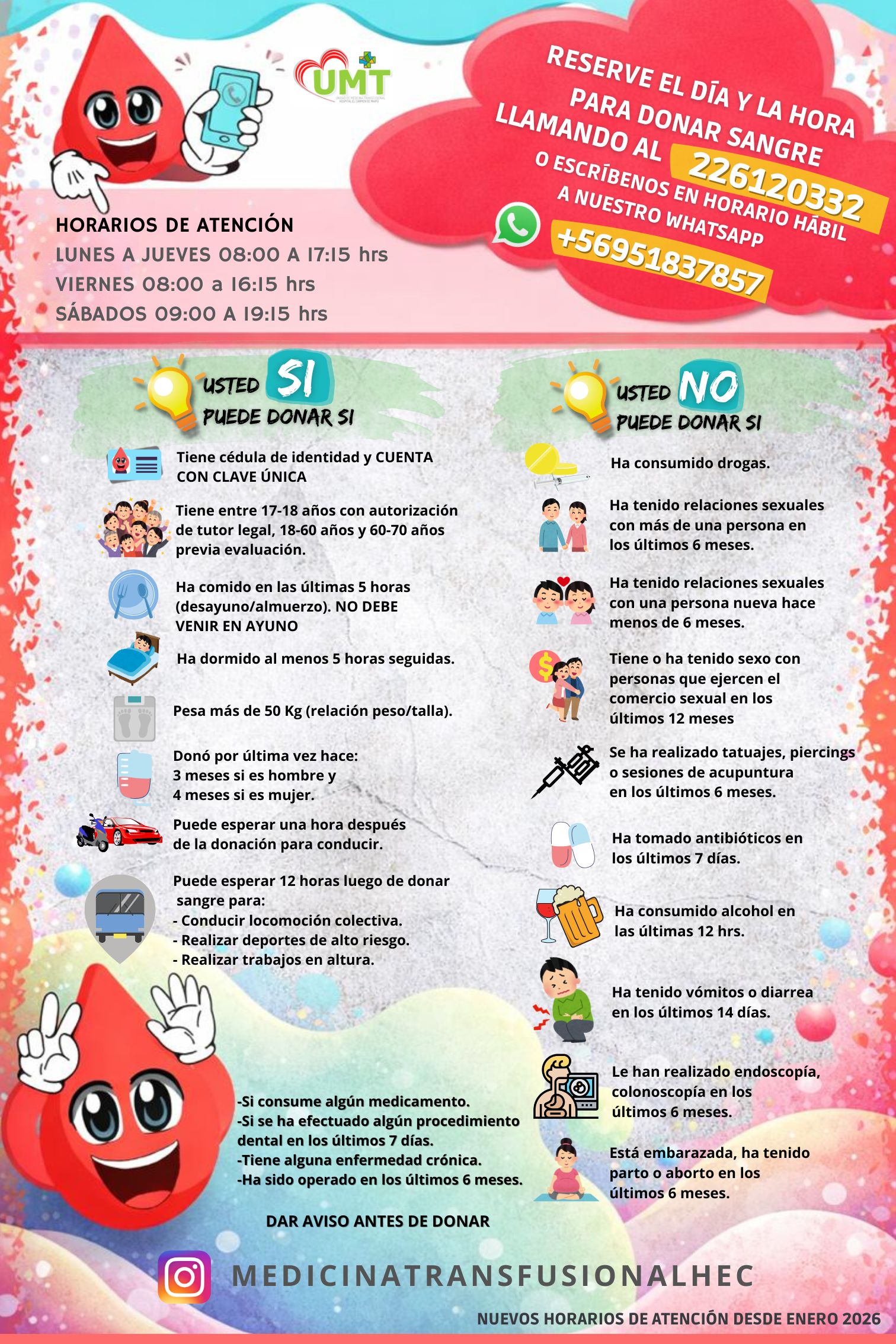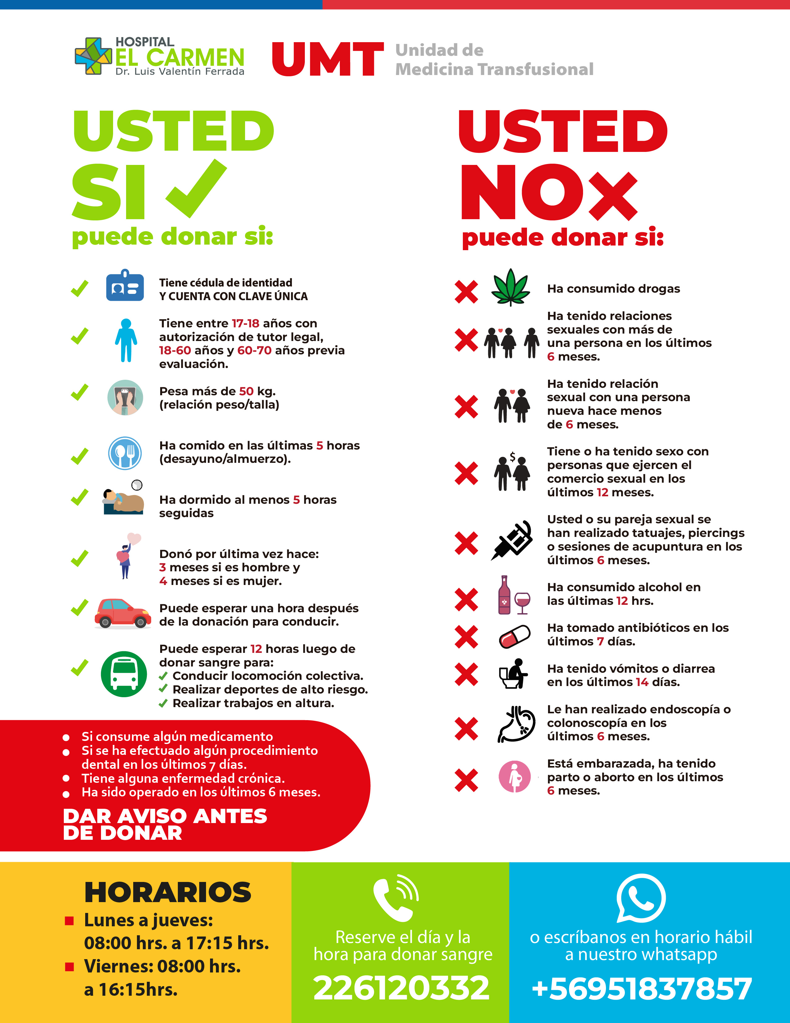 Para apoyar la alta demanda de transfusiones, la UMT implementa constantemente campañas comunicacionales en redes sociales destinadas a captar donadores altruistas y adicionalmente ha ampliado su horario de atención: